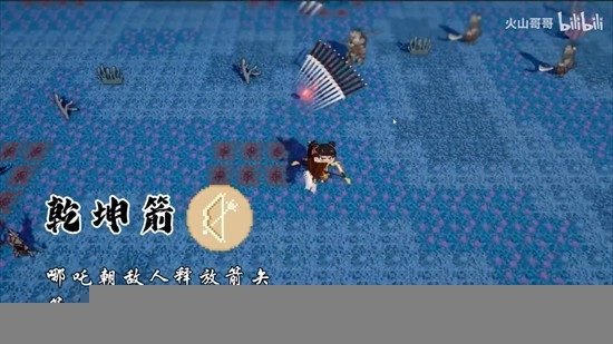 2、乾坤箭 哪吒朝敌人射出箭矢,随着箭矢数量增多,它们会展开成扇形散开,从而覆盖更广阔的区域。