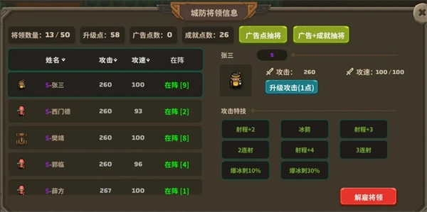 首先来聊聊将领,当前这个模式里只有三种类型的将领:第一种是投石车,它是主要的伤害来源,擅长范围伤害,技能点满后能眩晕敌人并造成二次伤害;第二种是炸弹人,作为副伤害来源,同样具备范围伤害能力,同时还能为城墙回血;第三种是弓箭手,单体伤害最高,在前10关是主力输出,到了后期主要依靠冰箭来发挥减速作用。