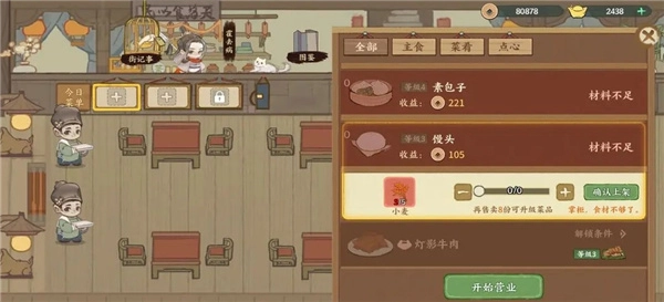 4、解锁两个上菜位后,即可搭配成套餐(需注意将菜品摆放整齐后再点击开始营业),套餐内的菜品数量并无限制,例如五谷丰登套餐里即使是10份米饭搭配1个馒头,也能享受50%的加成。