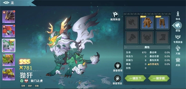 3、龙的升级界面设有六个格子,这些格子即为装备栏。每只龙都拥有六个装备栏,分别对应武器、头盔、护腿、胸甲、圣物和专武。其中前四种装备(武器、头盔、护腿、胸甲)包含普通、罕见、稀有、神话、传说、史诗六种品质;圣物可从时空幻境中获取;专武需小龙进化至9星后自动解锁,需要注意的是,并非每条龙都配备专武,具体信息可自行查阅游戏内的图鉴。