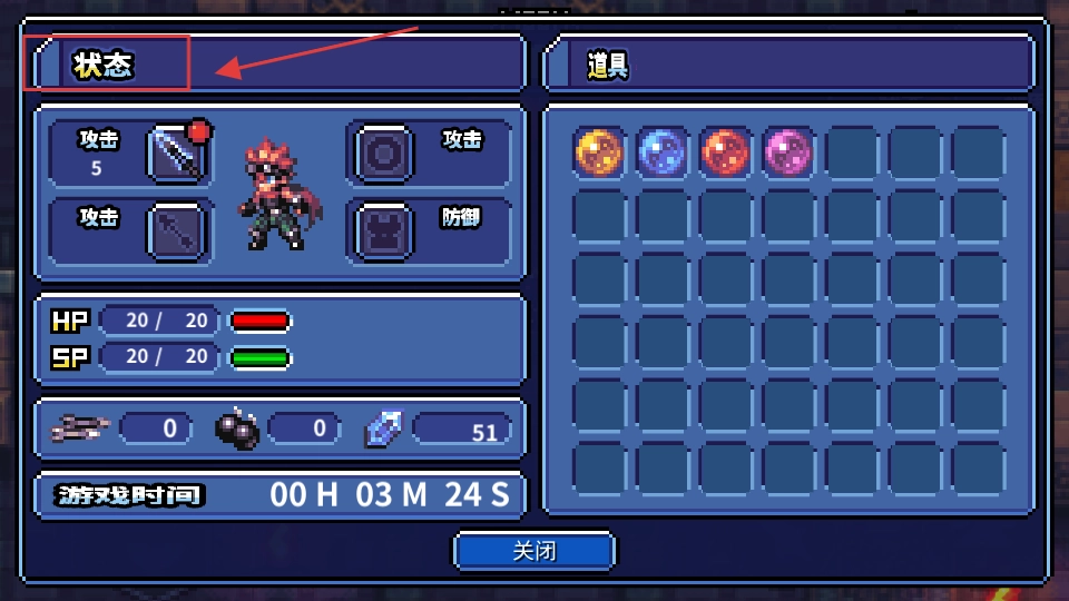 3、打开状态界面,留意攻击、防御、HP、SP以及道具数量,了解角色当下的战力水平和资源储备情况。