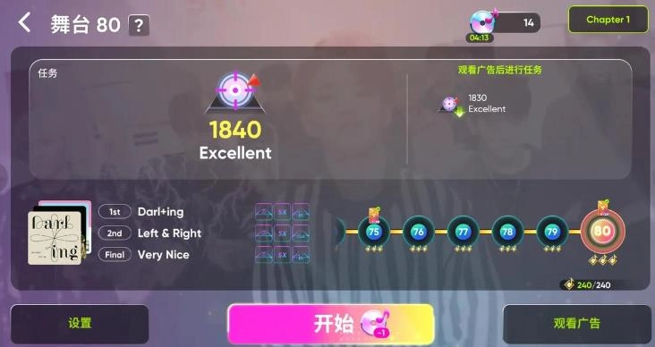 要是分数没达到要求,除了升卡这种办法之外,还能试着点击P1左下角进行设置,将模式调整为困难、5倍速、开启镜像、开启渐隐。设置的难度越高,得到的分数就会越高。