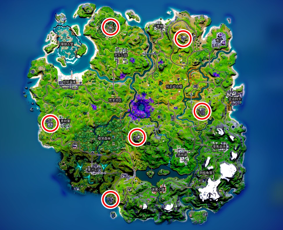 五个间谍基地的具体位置标注在下方图片中,而“阵营锁定宝箱”其实就是被封印的箱子,想要打开它,需要先通过电话亭变身,或者击败周边的守卫,之后再进行扫描操作。