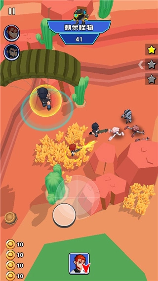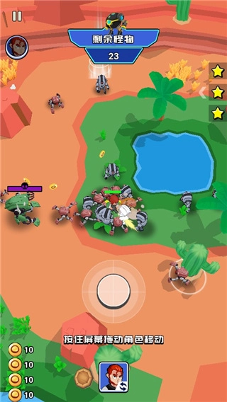 2、进入关卡后,可通过触摸屏幕来控制角色的移动方向,角色会自动瞄准并攻击敌人。