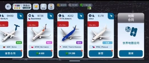 4、游戏内的合同共分为本地、地区、国际、地图、随机玩家五种类型,本地合同仅能签署附近较少数量的机场,并且本地合同通常只会刷出S和M型的飞机,但本地合同在合同界面无需绿币即可签署,一小时刷新一次,也可使用100银币刷新。地区合同可签署的目的地会有所增加,地区合同一般均为M型飞机,从地区合同开始就需要绿币来签署,价格通常在5000绿币左右,刷新时间一般为20小时左右,也可使用1000银币刷新。当升级至国际合同后,就能够签署世界各地的合同了,国际合同刷出的均为L型和少量X型飞机,价格在15000绿币左右,约45小时刷新一次,也可使用200金币刷新。随机玩家合同刷出的都是玩家的飞机,一般各种型号的飞机都有,随机刷出,随机玩家合同无需绿币签署,一小时刷新一次。世界合同是供玩家签署各地合同的,每个机场的世界合同可签署的地点会存在一些差异。