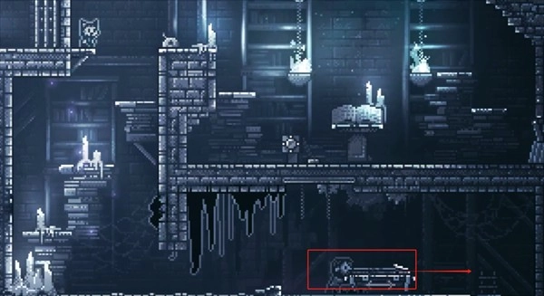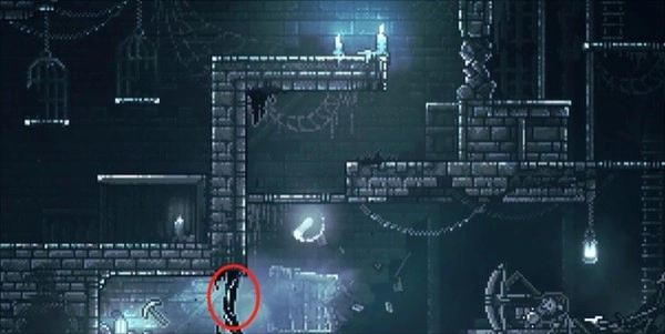2、爬下梯子,返回上一个场景,用射箭装置消灭挡住十字镐的黑色粘液,获得十字镐。