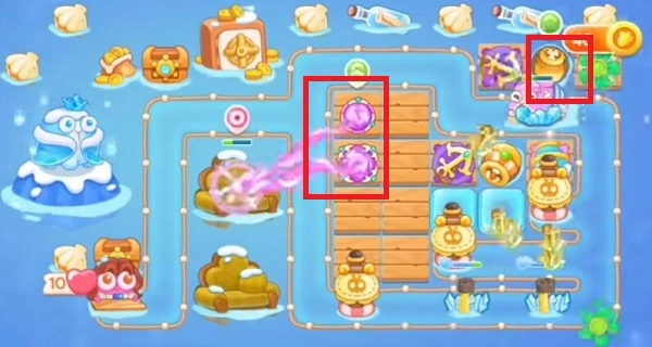 在第五波时,在左边位置添加船锚和鱼雷炮;打掉左上方的宝箱后,就能得到一个塔防火瓶。