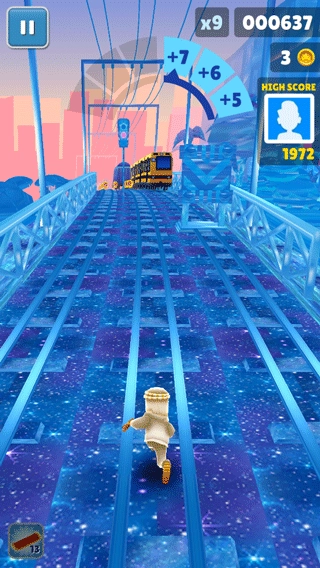 在这款以地铁为场景的跑酷游戏里,有个基础动作叫二连跳。用它能越过挡路的东西,要是先踩在障碍物上再跳第二次,就能直接跳到火车顶上了。