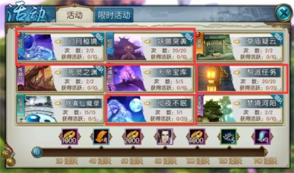 以下红框标注的幻月秘境,妖兽突袭而至,哪怕彻夜不眠参与其中也能获取经验!限时活动里的各项内容大多也能带来经验收益,不过受等级限制影响,部分活动目前还未解锁开启。