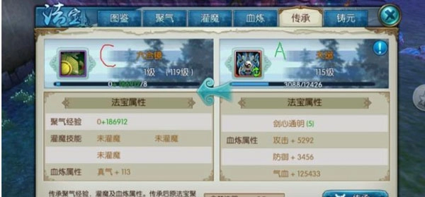 法宝传承的功能类似于炼器传承,更换法宝时能把原法宝的属性完整转移到新法宝上,这个过程需要消耗一个金梵法器,该道具可通过商城购买或乾坤币兑换获取。接下来重点说明如何利用传承机制更换法宝的血炼属性。举例来说,新手初期使用的法宝A,其血炼属性为攻击、防御、气血;后期获得目标法宝B,血炼属性是攻击、防御、爆伤加成。若想让法宝A拥有法宝B的血炼属性,需准备任意一个材料法宝C和两个金梵法器。具体步骤如下:首先将法宝A传承给材料法宝C,接着把法宝B传承给法宝A,最后把法宝C当作血炼材料来提升法宝A的血炼等级。这样操作后,法宝A会保留之前的攻击、防御血炼等级,聚气等级会被重置为零,而灌魔属性则会与法宝B保持一致。因此,在进行传承前,为避免更换法宝后一时无法洗出理想的灌魔技能,建议先对法宝B进行灌魔,洗出满意的技能后再开展传承操作。需要特别注意的是,传承时务必正确摆放法宝的位置,比如第一步将法宝A传承给材料法宝C的摆放方式应为: