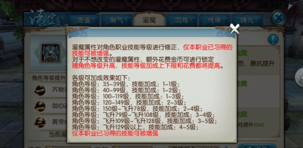 法宝灌魔是提升门派技能的途径,随着玩家等级上升,灌魔的技能等级会提高,锁技能灌魔所需的金币也会相应增加,用到的灌魔道具是真魂赦令,可从天帝宝库获取。在法宝技能的选择上,每个职业都有天书第四卷的被动加成,所以优先选被动技能是个不错的思路,之后再考虑性价比高的主动技能。拿青云来说,洗出剑心通明是必备的,还能考虑天尊法身和养生主,或者选一个大招比如七劫或自爆。因为我经常切换大招,现在用的是三个被动技能,搭配天书第四卷的被动加成效果很可观。而青云自爆流法宝灌魔的理想技能组合是剑心通明、养生主、绝圣弃智。不过锁技能洗练太耗金币(血炼毁一生,灌魔穷三代),而且现在门派数量每增加一个,难度又会大不少,建议大家量力而行,适可而止,理性进行灌魔操作。