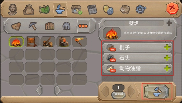 要制作某样工具,得先把所需的材料都备齐,材料凑够后点击锻造选项就能启动制作流程。比如做个壁炉,只要准备5根木棍、3块石头和两份动物油脂,就能锻造出来了。