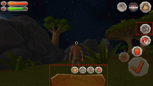 若想在地面搭建专属小屋,可点击界面右上方红框标注的图标;留意人物周围的小圆定位标识,就能挑选需要放置的物品,开启你的创造之旅。