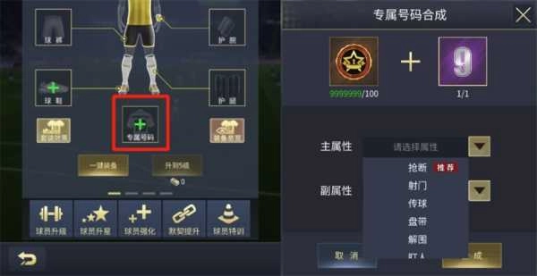 当我们看到那些熟悉的号码时,总会不由自主地想起球员们在球场上拼搏的身影。现在,你也能为自己麾下的球员挑选专属号码啦!只需在装备界面点击人物下方的方框,就能进入号码设定界面。想要合成专属号码,除了需要你心仪的号码道具外,还得准备专属证明,而且你可以根据需求选择合适的属性加成。悄悄告诉你,这些合成材料都能从接下来要介绍的“巅峰对决”玩法中获取哦~