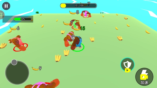 场景里随机散布着大量香蕉,随着场景的推进,香蕉的刷新密度会不断提高,以此满足猩猩快速积累经验的需求。