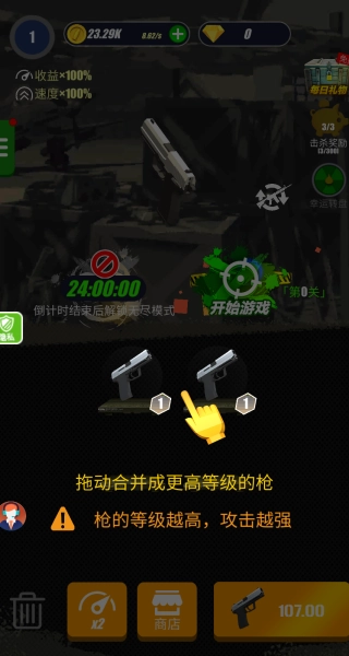 把相同的枪支拖到一起合成,就能解锁更高级的枪支,进而提升攻击力,更迅速地消灭僵尸。