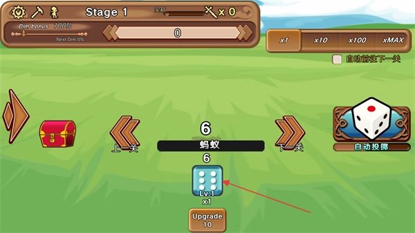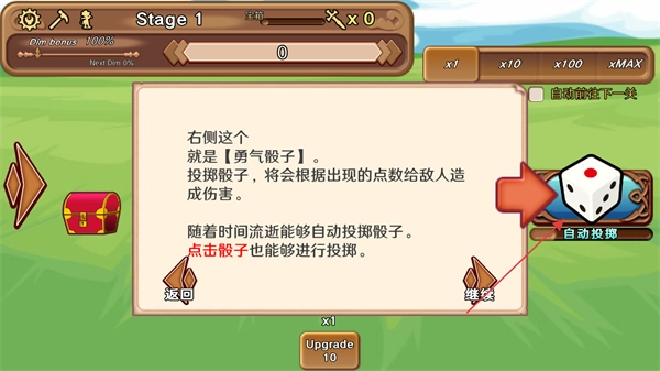 进入游戏界面后,先熟悉Stage1的基础操作方式:右侧的勇气骰子支持手动点击投掷,也会随着时间推移自动投掷并对敌人产生伤害效果。
