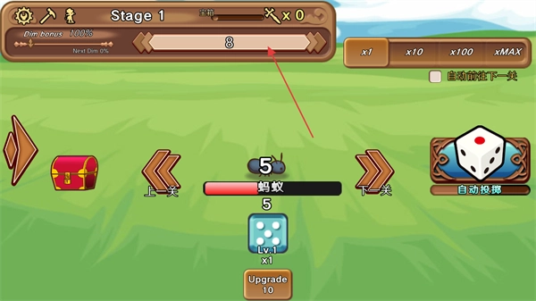 点击勇气骰子后,会依据其显示的点数,对“蚂蚁”这一敌人造成对应点数的伤害。