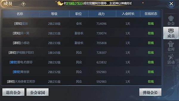 我们在成员界面查看公会里的兄弟们时,最上方有一排筛选功能,能帮大家清晰了解公会内的职业分布和成员等级情况。