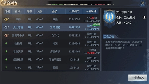 在列表界面,我们能查看同区其他帮会的情况,知晓对方的状况!毕竟知己知彼,才能百战不殆。