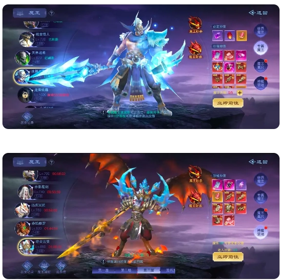 活动时间与层数:跨服深渊魔王活动每日有两次参与机会,分别在早晨11点和晚上19点刷新。根据玩家的等级,可以进入不同层数的挑战,层数越高,BOSS难度越大,但奖励也更为丰厚。