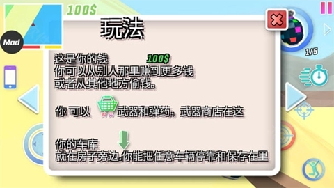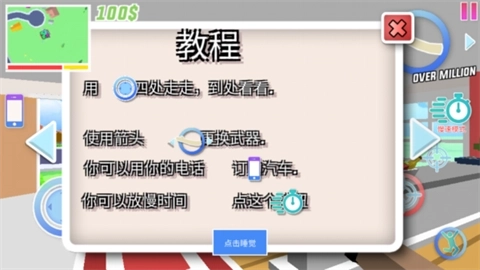 4、进入游戏后会出现教程指引,通过滑动摇杆来操控角色移动,利用箭头按钮能够切换不同武器,点击手机图标则可以订购汽车。