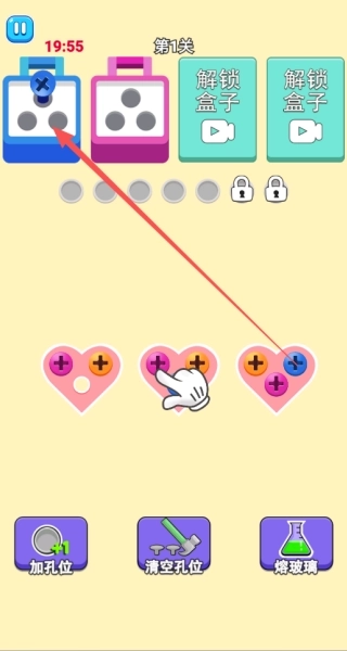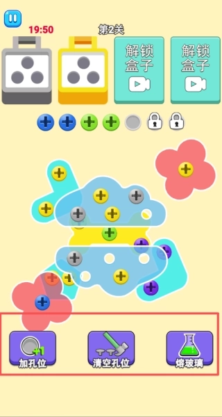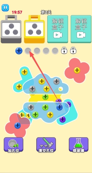 1、点击彩色螺丝,使其滑入对应颜色的收纳盒中,当收纳盒内集满三个相同颜色的螺丝时,即可触发消除效果。