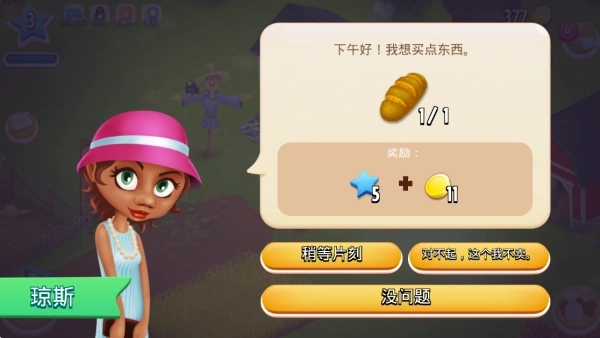 3.农场会有客人前来光顾,购买各类农产品,玩家得提前准备制作好。把这些农产品提供给客人后,就能获得金币和星星啦!