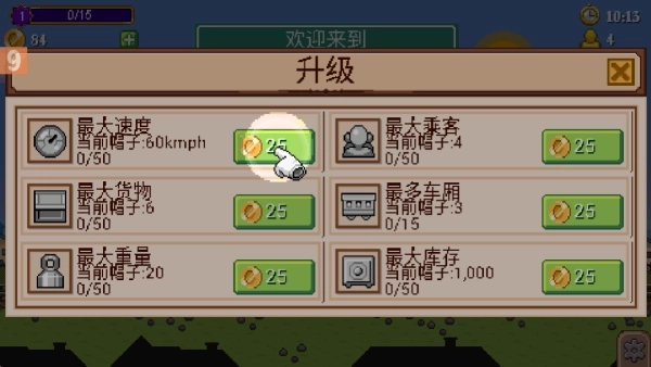 2.玩家能够对火车的各项属性进行升级,像速度、载客量、车厢数等都包含在内,不过游戏前期金币比较紧缺,所以需要玩家妥善规划升级方案。