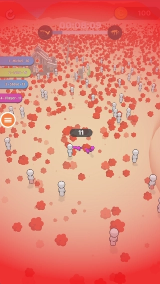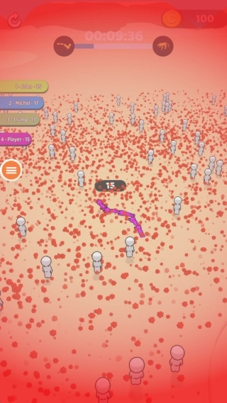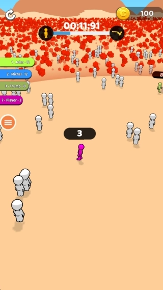 1、进入游戏后控制小人移动,在场景里主动拾取散落的同类小人,慢慢壮大队伍的规模。