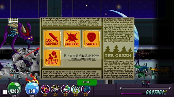 3、战斗中解锁增益道具,获取伤害翻倍、护盾防御等效果,强化巨兽的战斗能力。