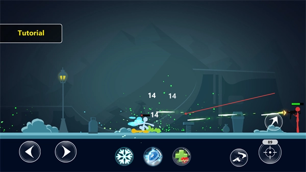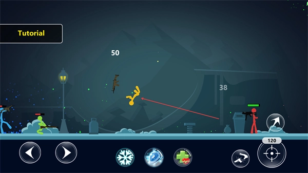 1、在教程关卡中,操控火柴人部队移动,使用武器攻击敌方单位,积累击杀数推进战斗。
