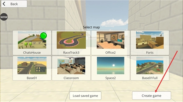 进入地图选择界面后,你可以选择ChaloHouse、RaceTrack3等不同的场景地图,选好目标地图后点击Create-game按钮,就能创建对局并进入相应的射击战场。