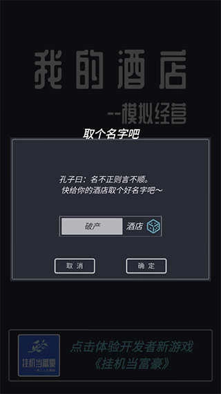 2、进入之后,务必先为咱们酒店取一个响亮的名字。毕竟孔子曾说“名不正则言不顺”,大家不妨参考一下小编取的“破产酒店”这个名字。