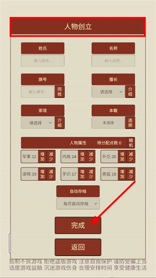 1、点击“新的人生”按钮,进入角色创建界面,完成姓氏、家境等信息的设置后,点击“完成”按钮。