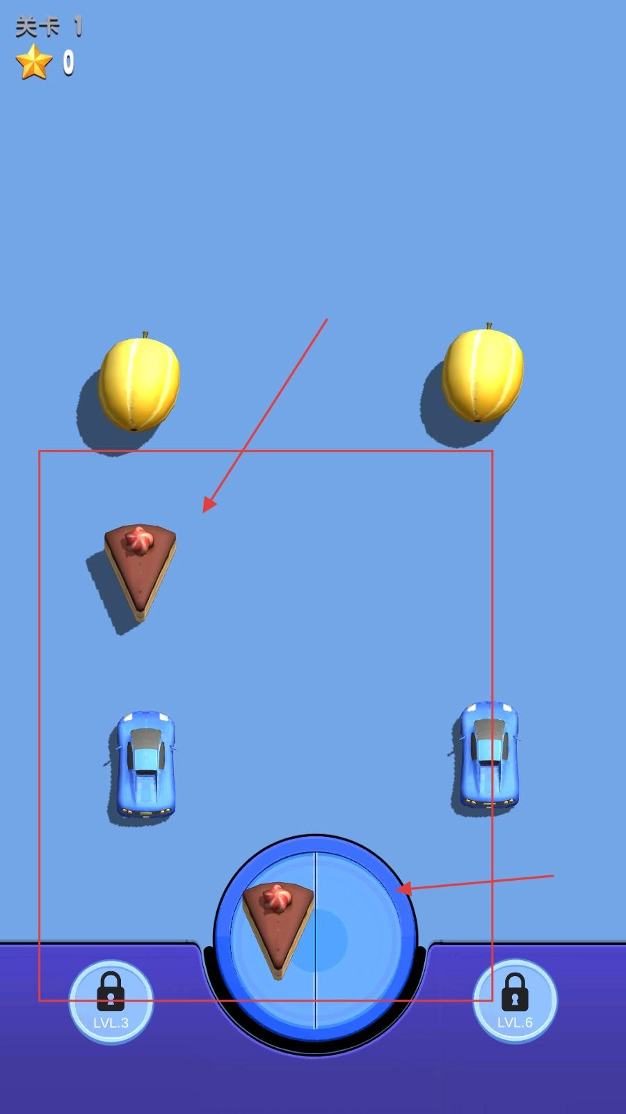 玩家在关卡1的场景里,能依据屏幕上的提示进行操作,把蛋糕之类的物品收集到下方的蓝色区域上。