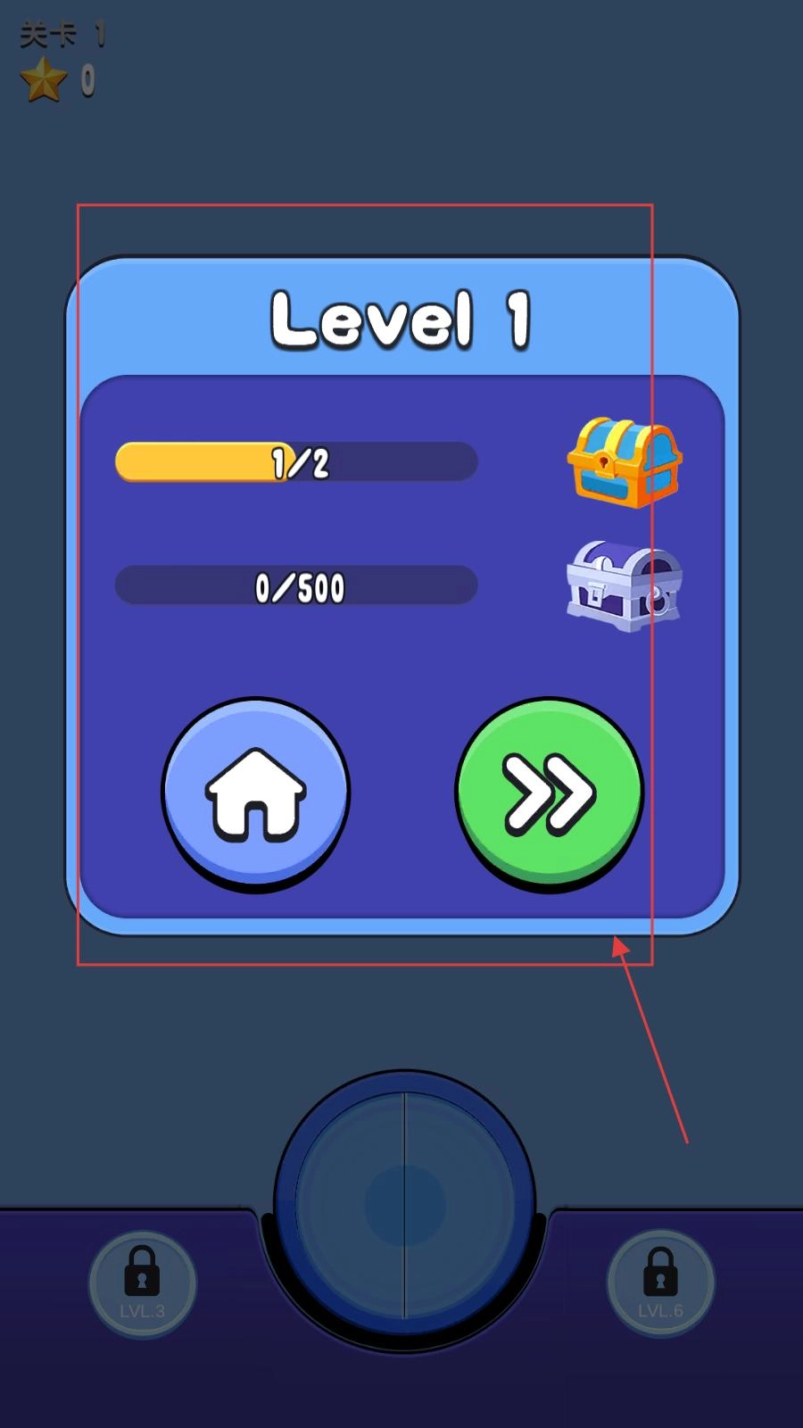 完成关卡1的收集任务后,会出现关卡进度界面,点击绿色箭头按钮就能进入游戏的下一部分。