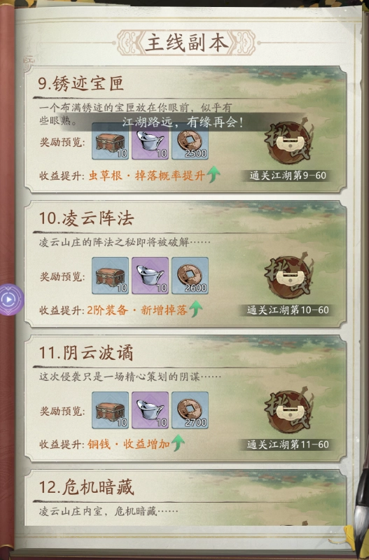 2、主线副本:通关后可获取额外收益,像江湖阅历、铜钱等奖励都会有所增加。