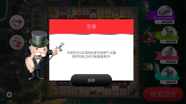 无论何时,玩家能够与对手就没有建筑物的地皮进行交易,按照商谈顺序依次处理交易。玩家之间禁止借贷行为。