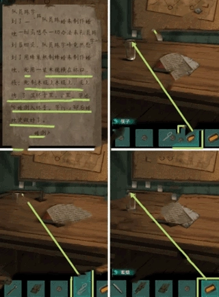 然后点击望远镜,再点击桌子上的纸条,然后点击地图按顺序使用指南针获得密码,在笔记本中输入“ESWN”密码,查看线索获得钥匙。之后使用钥匙开启铁盒,用锤子砸开图中木箱,然后把获得的枯草放到火堆上,使用镜片点燃,将铁盒放上去把蜂巢融化。获得蜜蜡后玩家回到帐篷内桌子位置,将筷子放到杯口,绑上绳子,将蜜蜡放进去获得蜡烛