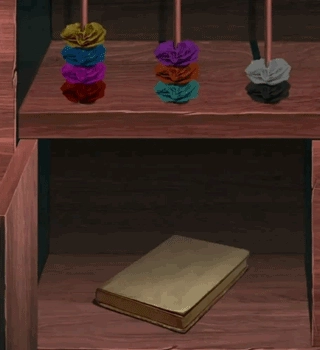进入右侧场景后,先记住进门处纸灯的颜色;接着点击左侧柜子获取道具,再根据图示调整纸花的摆放位置来拿到书,并记住书中的线索;最后利用这些线索解开圆片机关。