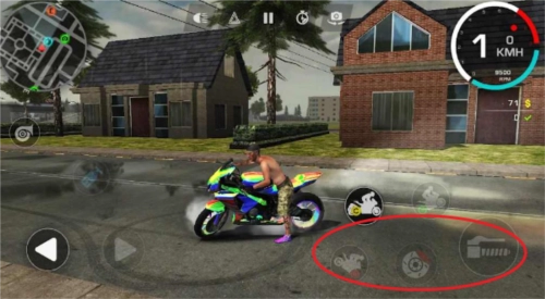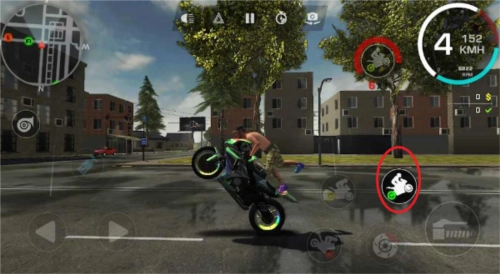 屏幕右侧的第二个动作是摩托车车头抬起,若与驾驶键同时按下,就能做出车头翘起向前行驶的特技动作。