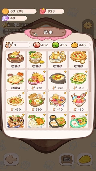 菜单前几个第一级不增加人气,之后升级到第二级可提升1个人气,第三级即为满级,升级到第三级能提升2个人气。升级过程中价格也会随之上涨,这里的价格指的是饼干数量(饼干可用来购买家具)。升级需要满足一定的前提条件,当达到条件时会出现上升箭头(如图所示);进行厨艺挖掘时,要注意不要点击过快,否则可能错过消除道具。可以尝试快速连续点击不同行、不同列且距离较远的位置,这样能降低失误的概率。