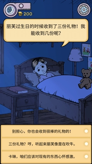 9、卡琳希望打开礼物再睡觉,可以选择第二个选项