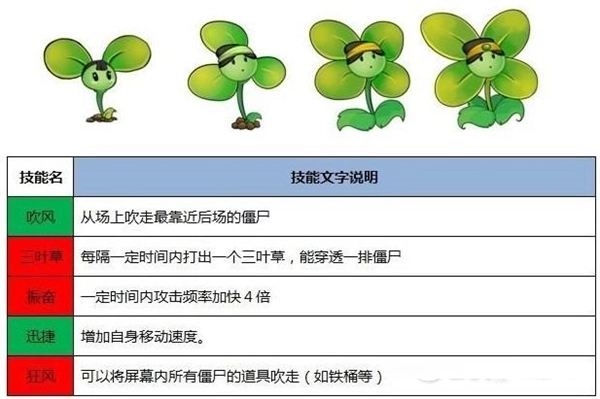 可吹走场上的僵尸,并发出三叶草攻击。