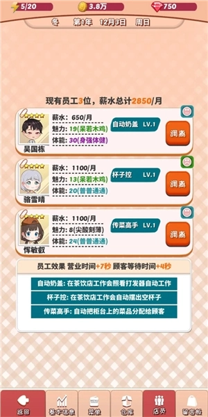 这是我在用得三个员工,一个上杯子,一个上菜,一个自动做奶盖。根据我的菜谱,我只需要煮茶,制冰,打汁就可以了,把茶放在桌子上后,员工自动发给客人,这大大的节省了我的操作步骤,当然,我还没有遇到更好用得,也许后面会出现技能更好的员工,那就到时再换了。总之,一切都是为了更顺手更快速。