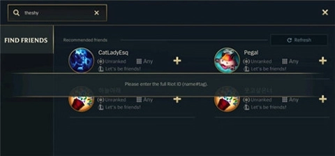 在查找和添加好友的过程中会出现提示,需要玩家输入对方完整的RiotID,这里务必留意,添加时要把昵称后面的数字也一并输入进去。