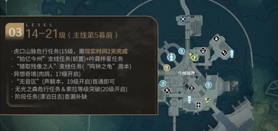 主线第四幕完结、第五、六幕在21级开启,中间还有20级突破索拉等级一道门槛,战线开始拉长、这个区间开始有一些自由时间去探索,有几个经验较多的点可以供漂泊者优先选择拿经验。15级开启危行任务 虎口山脉第一幕/做完隔天解锁第二幕19级解锁无音区,可每个都扫一遍、扩充图鉴,提升数据坞等级20级同时开启危行任务 无光之森 推荐优先处理任务完成后才能解锁boss 飞廉之猩(队伍中有忌炎和鉴心的需要飞廉的突破材料)