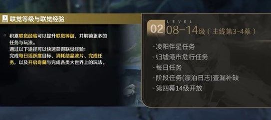 主线第三幕完结,第四幕在14级开启,开始卡主线等级,但同时开启了很多新任务,将凌阳:伴星任务、危行任务:归墟港市(不用跑图,自动传到任务地点) 这两个较为重要的任务做完,再领一下漂泊日志里的经验基本稳稳能达到14级,这期间依然不用太考虑其他支线,经验很充足。3.联觉等级14-21级,