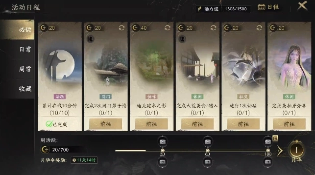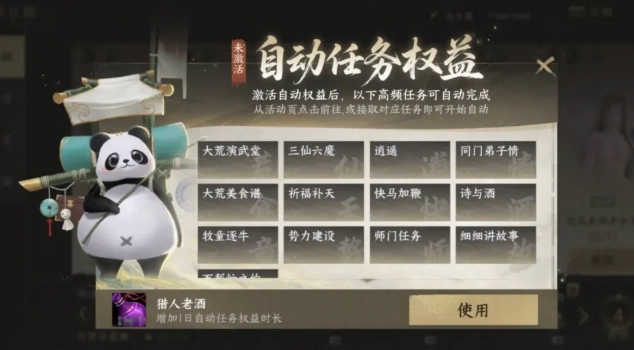 可正常完成绝大部分的日常、周常活跃玩法,包括种树、泡澡、押镖等日常活动;其中如三仙演武、大荒美食谱、同门、逍遥等高频活跃玩法,还可以使用猎人老酒开启自动任务功能完成,草精到家、少年演武堂、小伊找妈妈,青纱迷踪等玩法。